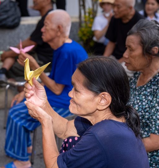Buổi lễ diễn ra sôi động với tiếng trống rộn ràng và màn múa lân đầy màu sắc, mang lại niềm vui cho các cụ khi họ mỉm cười, vỗ tay và cùng nhau chia sẻ những bài hát, câu chuyện về quê hương của mình. Mỗi cụ đều nhận được một con hạc giấy origami — biểu tượng của hòa bình, hy vọng và trường thọ trong văn hóa Nhật Bản — góp phần kết nối ý nghĩa giữa các thế hệ và nền văn hóa. |